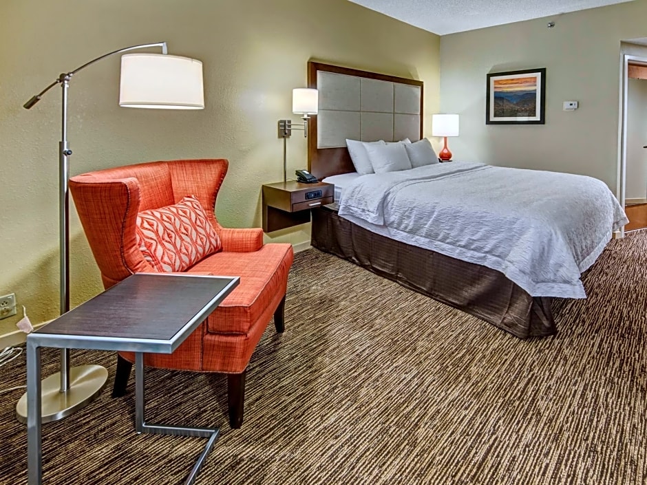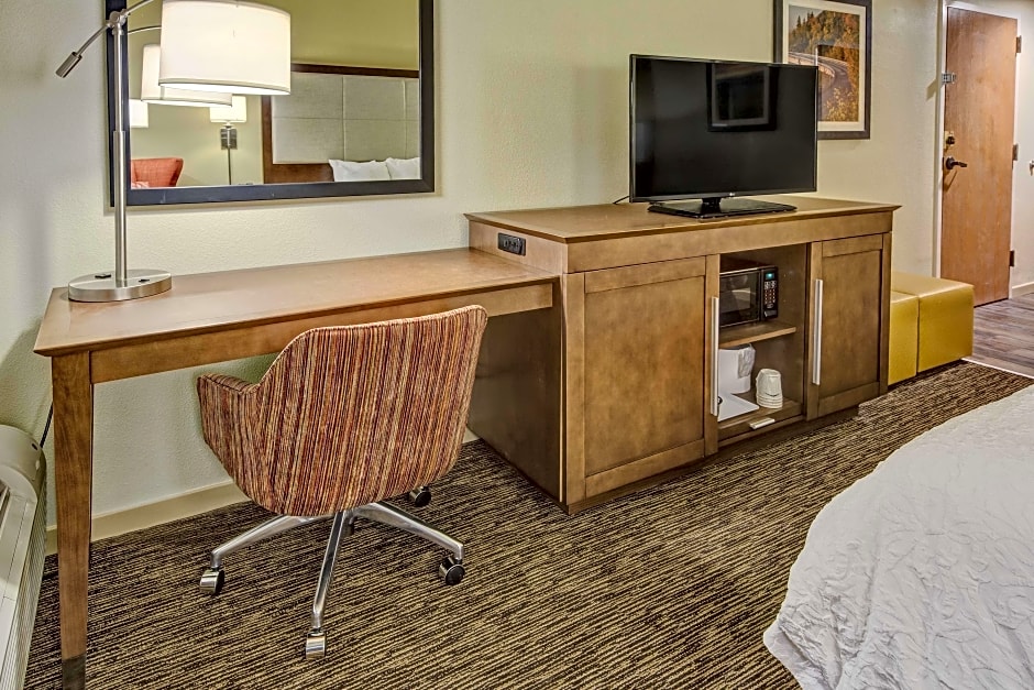 This spacious room features a chair with ottoman, 32-inch flat-screen TV and a large work desk.
