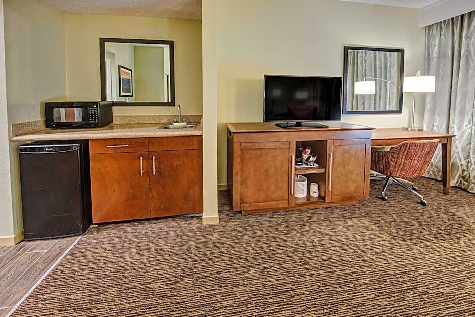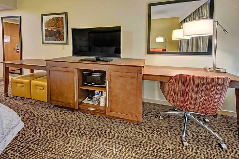 This spacious room features a chair with ottoman, 32-inch flat-screen TV and a large work desk.